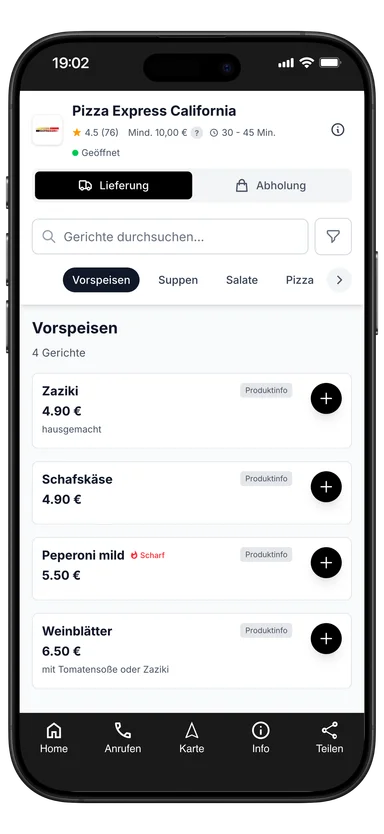 Scharfmit milder Peperoni, Mozzarella, Vorderschinken, Oliven, Artischocken und Weißkäse